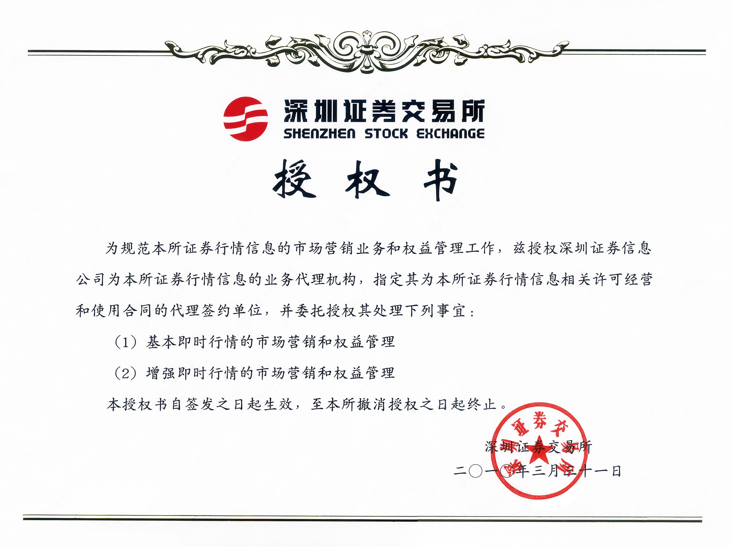 深圳證券信息有限公司經(jīng)深圳證券交易所獨家授權,全權代表深交所經(jīng)營(yíng)深市行情信息, 負責深交所行情境內外授權使用工作。